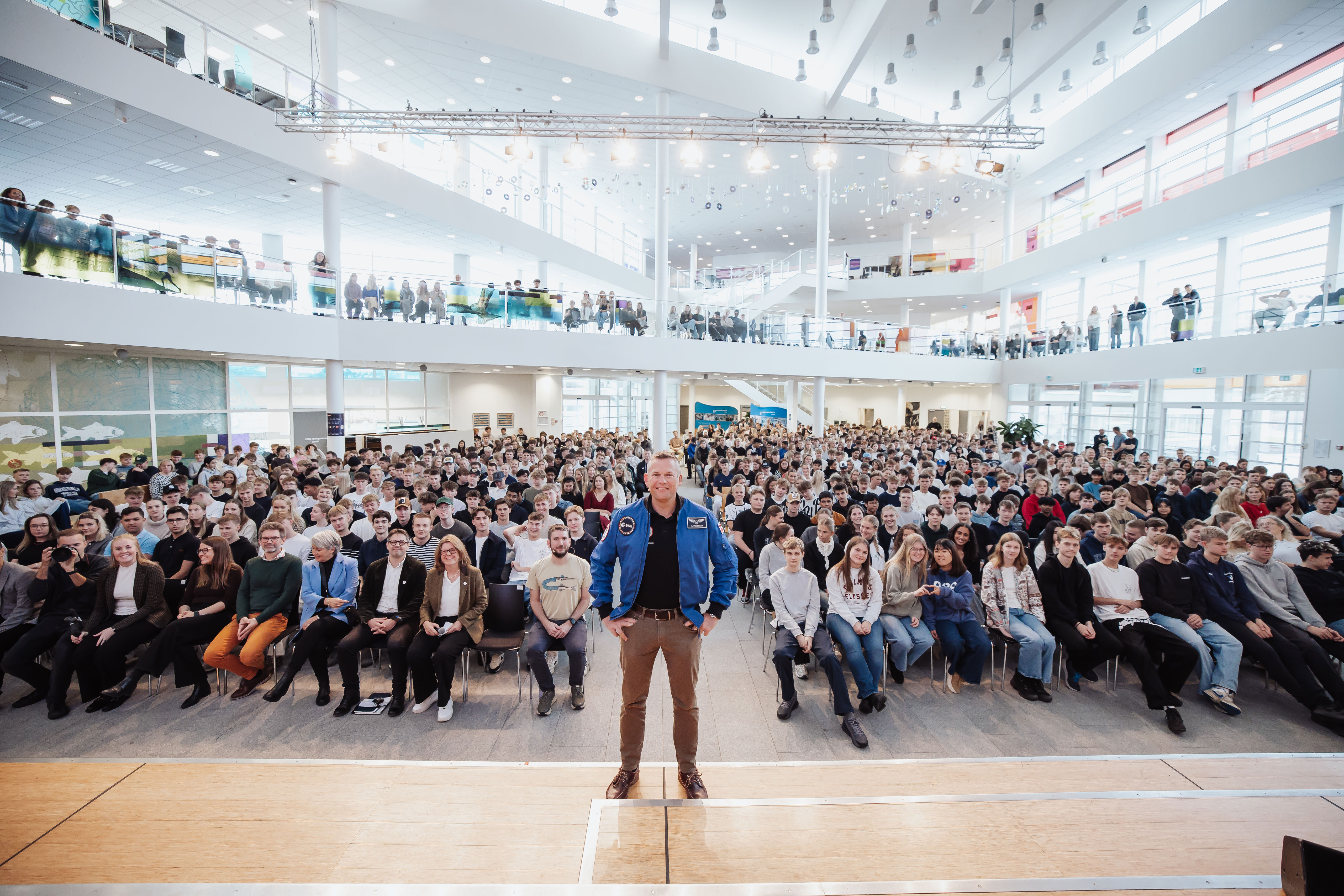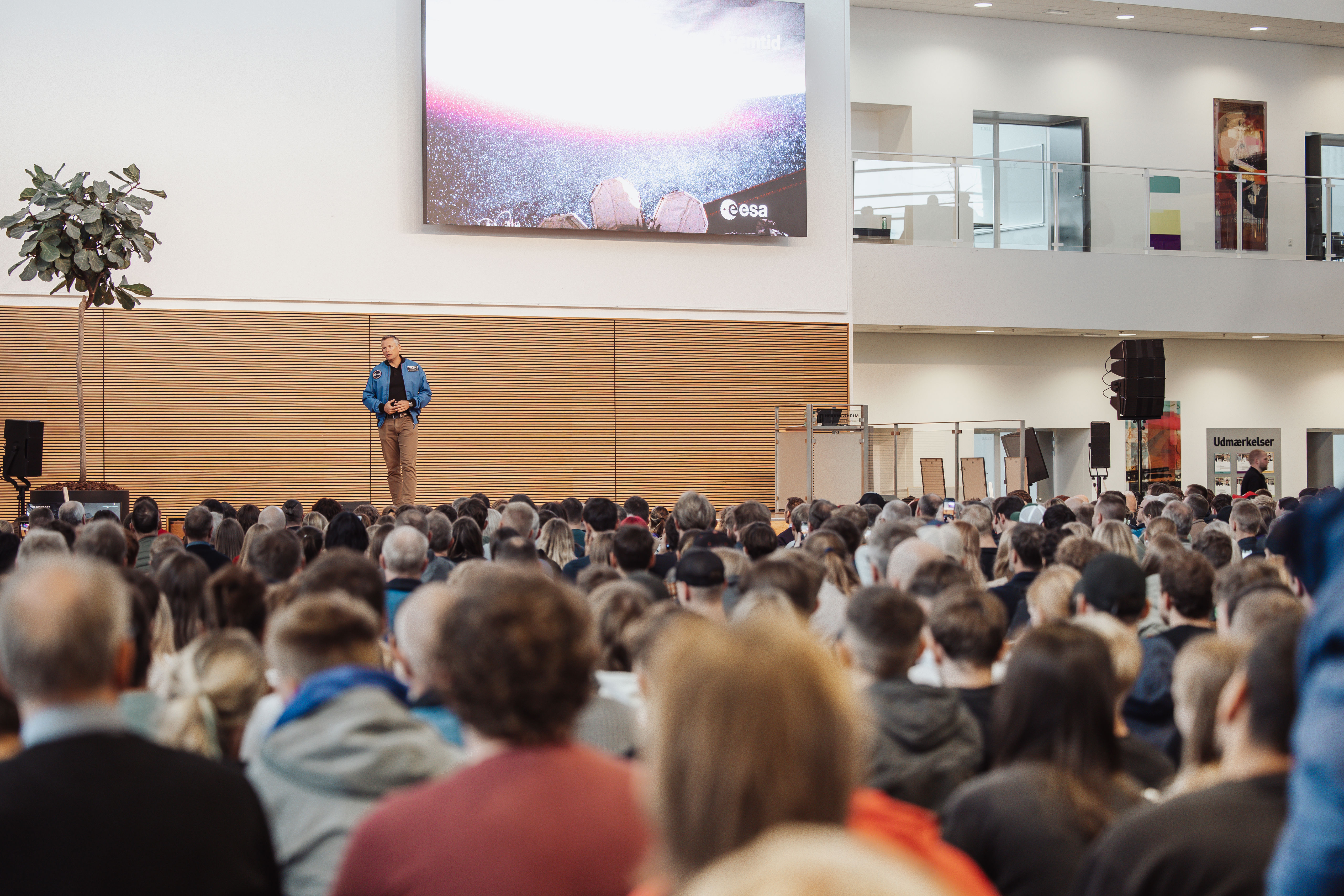 Her kunne flere end 2000 elever og ansatte fra Herningsholms erhvervsrettede uddannelser, erhvervsuddannelserne, HHX, HTX og 10. klasse høre ESA-astronauten fortælle om sin imponerende seks måneder lange Huginn-mission til den internationale rumstation, ISS.