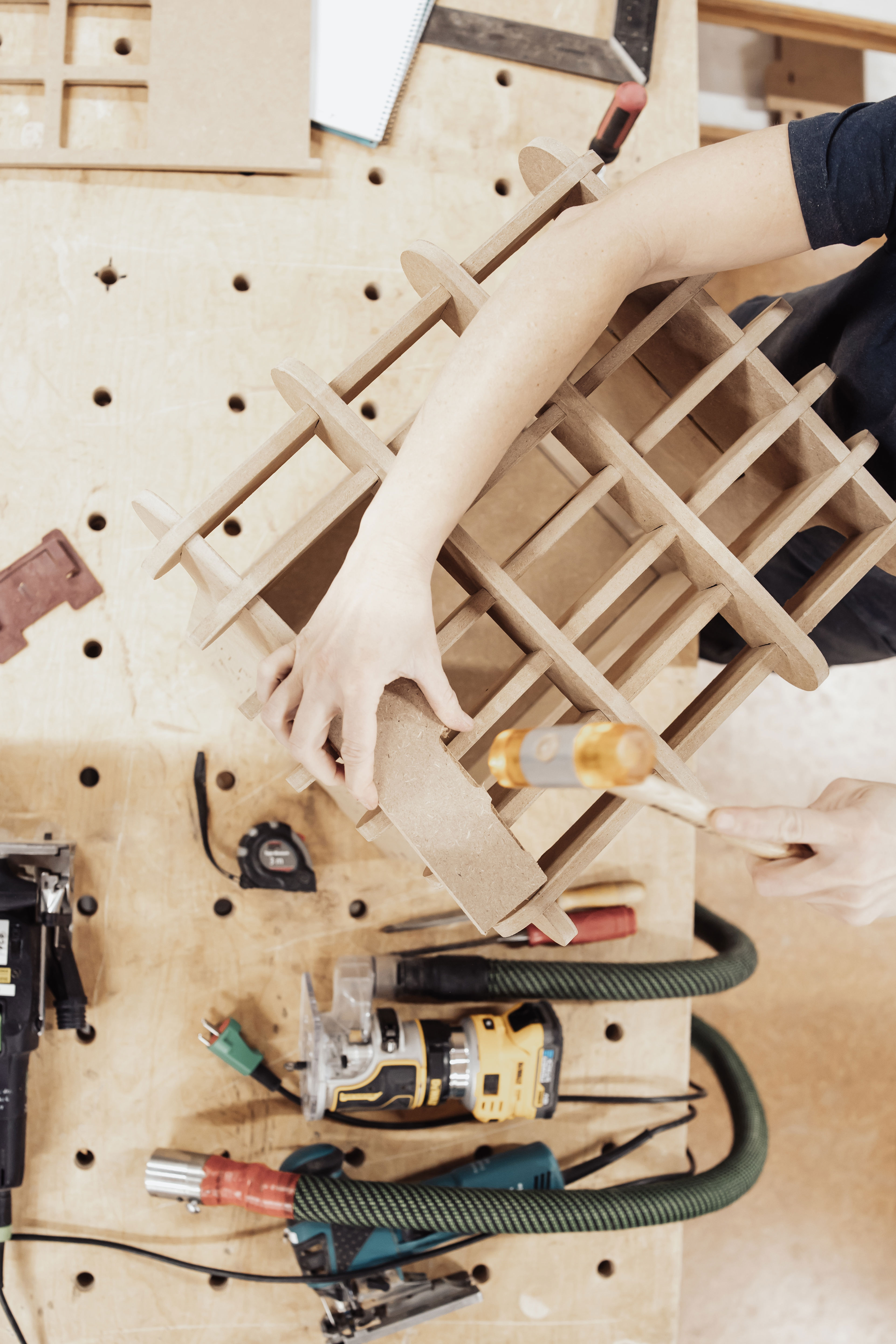 Giovanna arbejdede på flere projekter under sit ophold, men hun er særligt glad for en lille, multifunktionel skammel, hun har designet med inspiration fra en klassisk flaskekasse og efterfølgende produceret i snedkerværkstedet med CNC-teknologi.