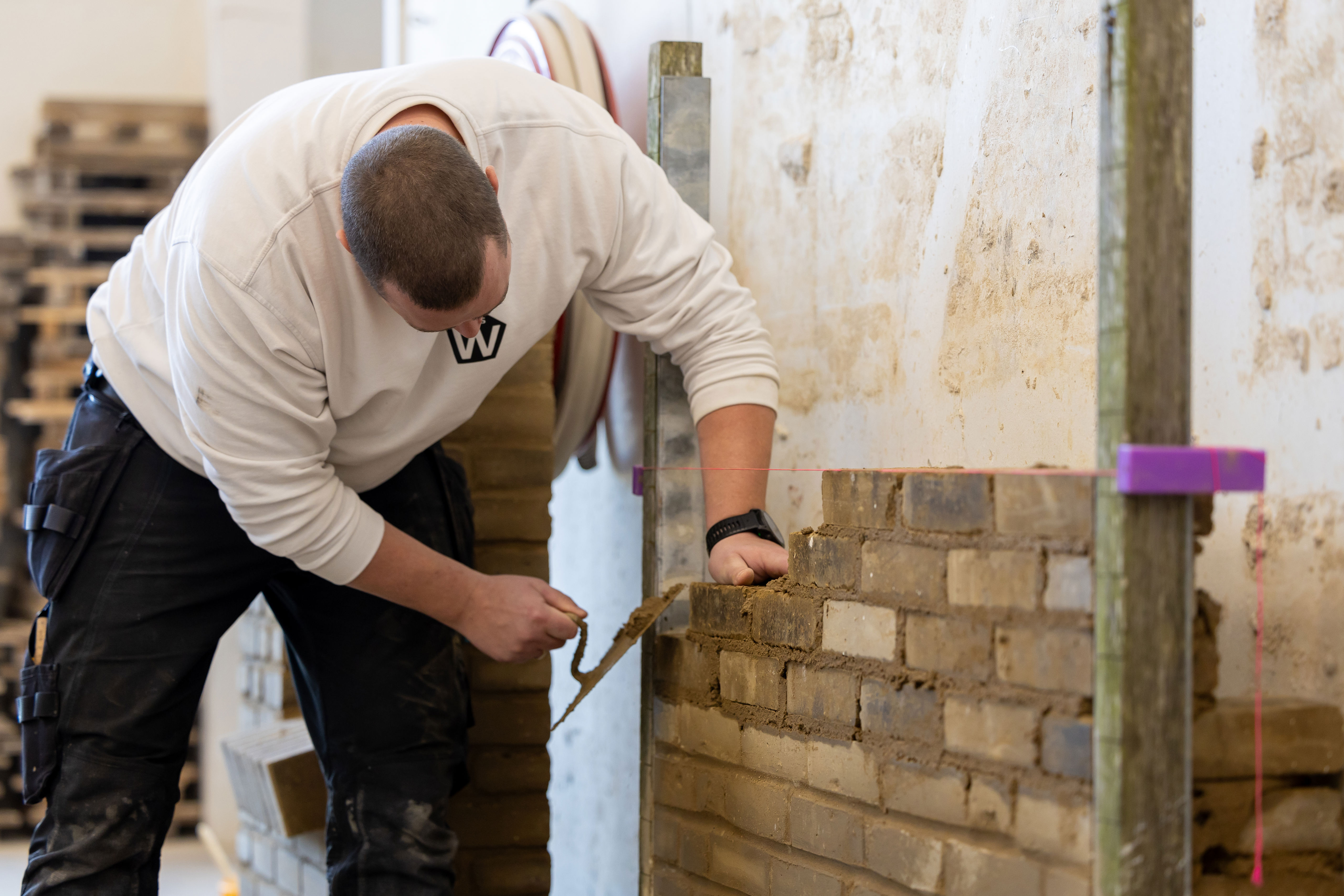 Murerbaljen er fyldt med lermørtel. Murerelev Jeppe Hedeager Andersen dykker murerskeen ned i baljen, samler en klat mørtel op og smider den på sine mursten for at gøre klar til næste sten. I hånden holder han en lersten, han sætter oven på sin klat mørtel.