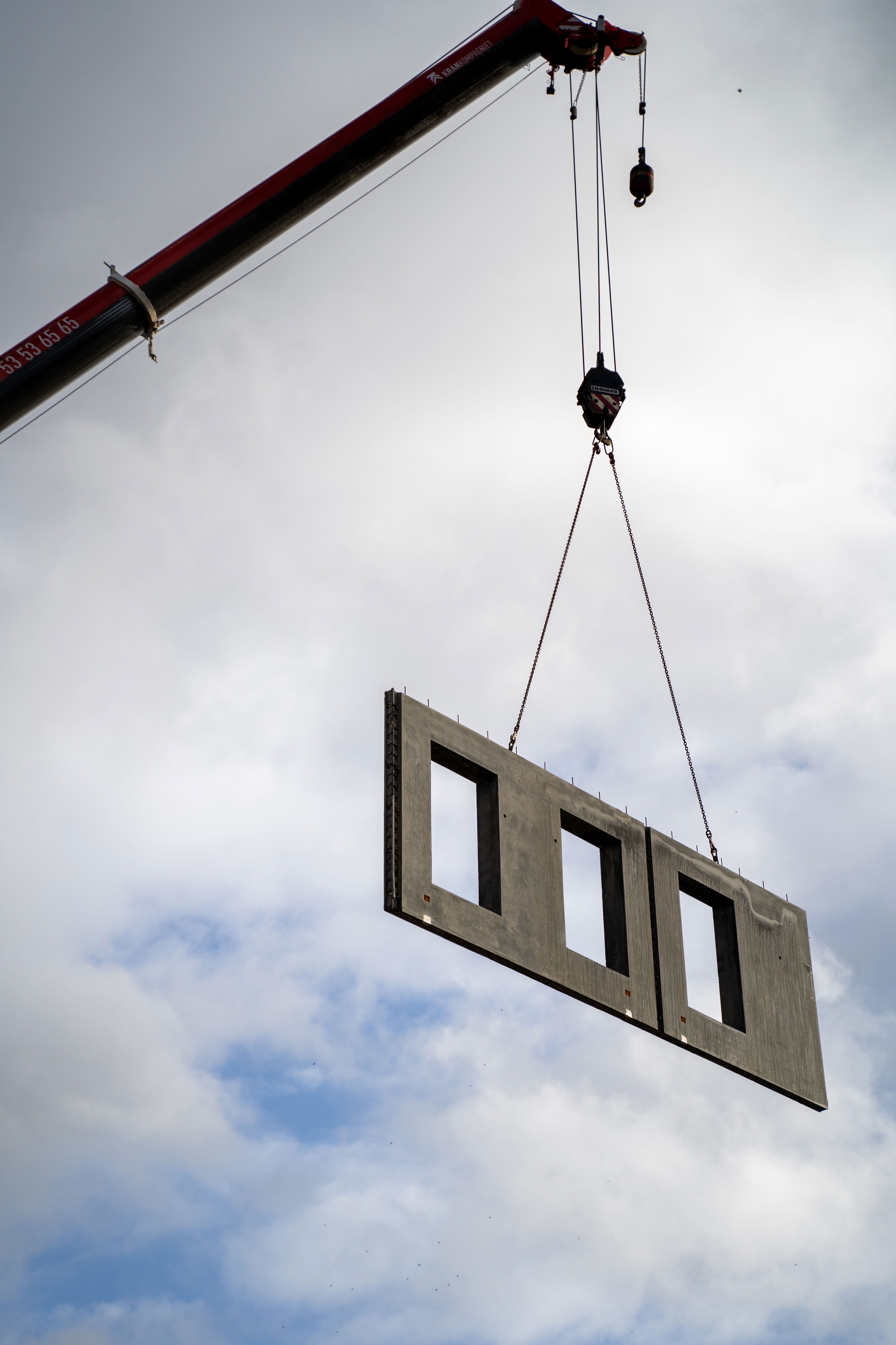 Den gule hjelm sidder sikkert på hovedet af betonarbejderen, og hænderne arbejder omhyggeligt med at hænge de kraftige kæder fast på det rå betonelement. Få sekunder senere svæver den i luften og er klar til at blive monteret på 3. etage.