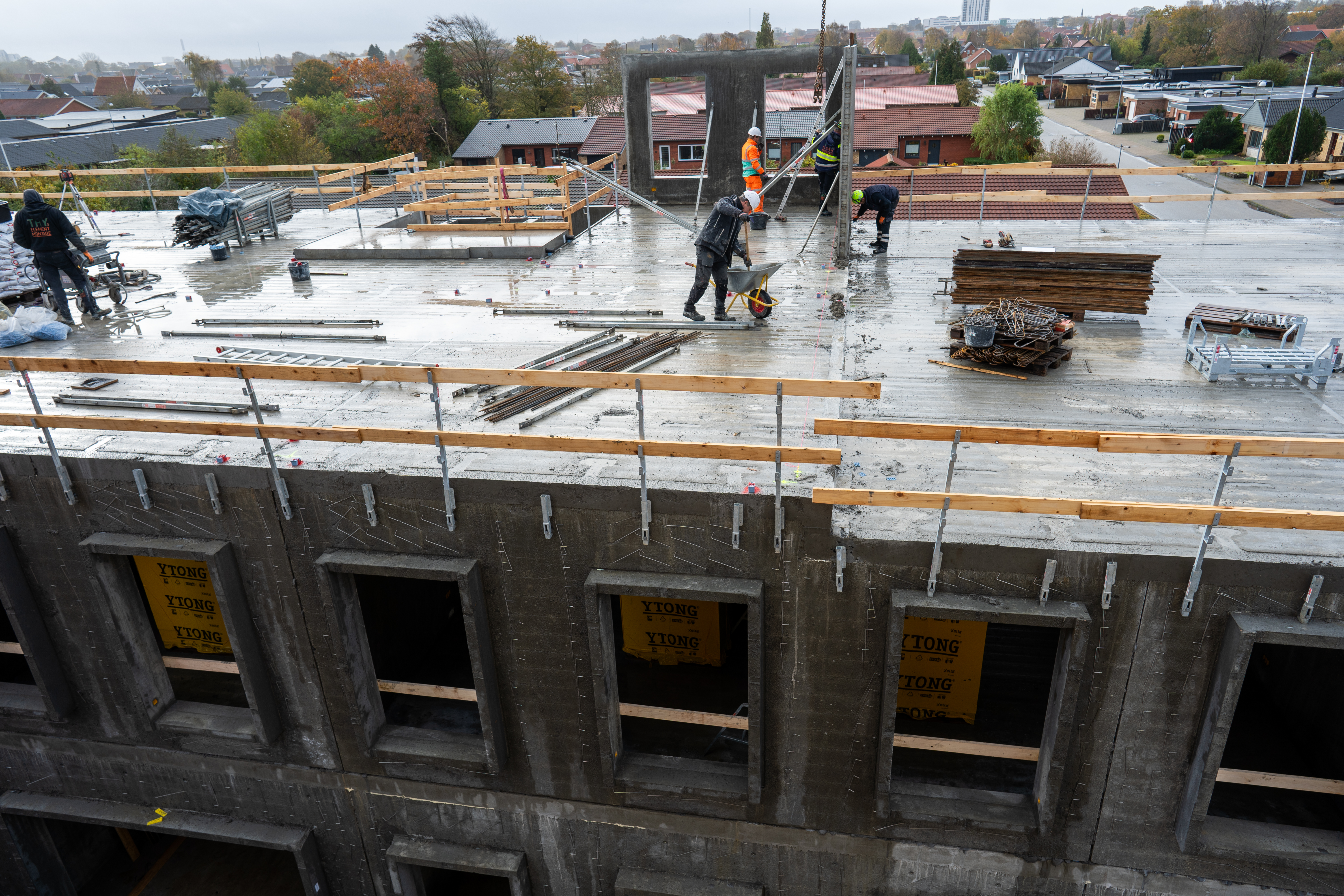 Den gule hjelm sidder sikkert på hovedet af betonarbejderen, og hænderne arbejder omhyggeligt med at hænge de kraftige kæder fast på det rå betonelement. Få sekunder senere svæver den i luften og er klar til at blive monteret på 3. etage.