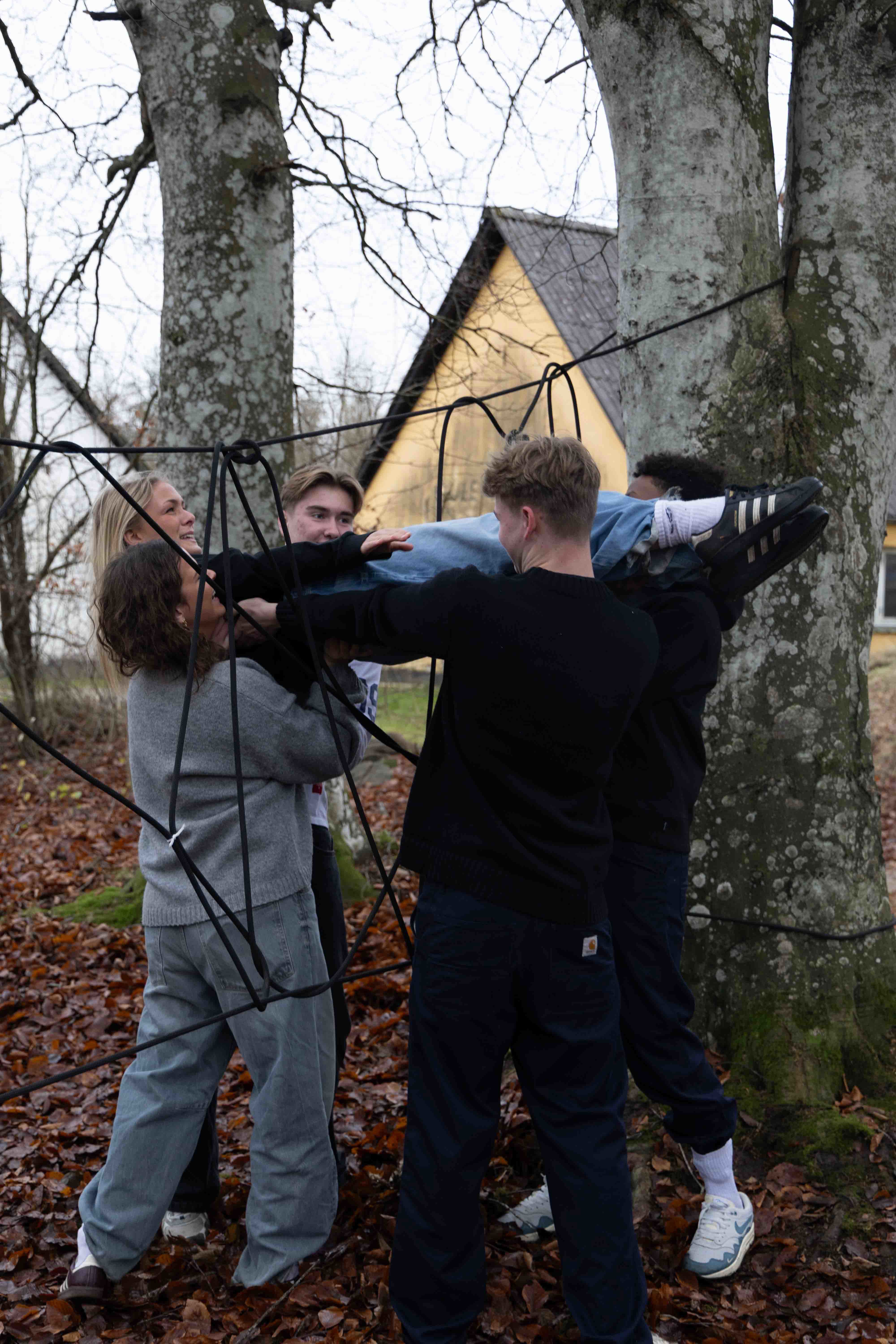 En af øvelserne bestod i, at grupperne skulle få alle medlemmer igennem et såkaldt “edderkoppespind” af snore, spændt ud mellem træer cirka en meter over jorden. Hvert hul i spindet måtte kun bruges én gang, og opgaven var først løst, når alle var kommet sikkert igennem. Opgaven krævede både planlægning, kommunikation og tillid.