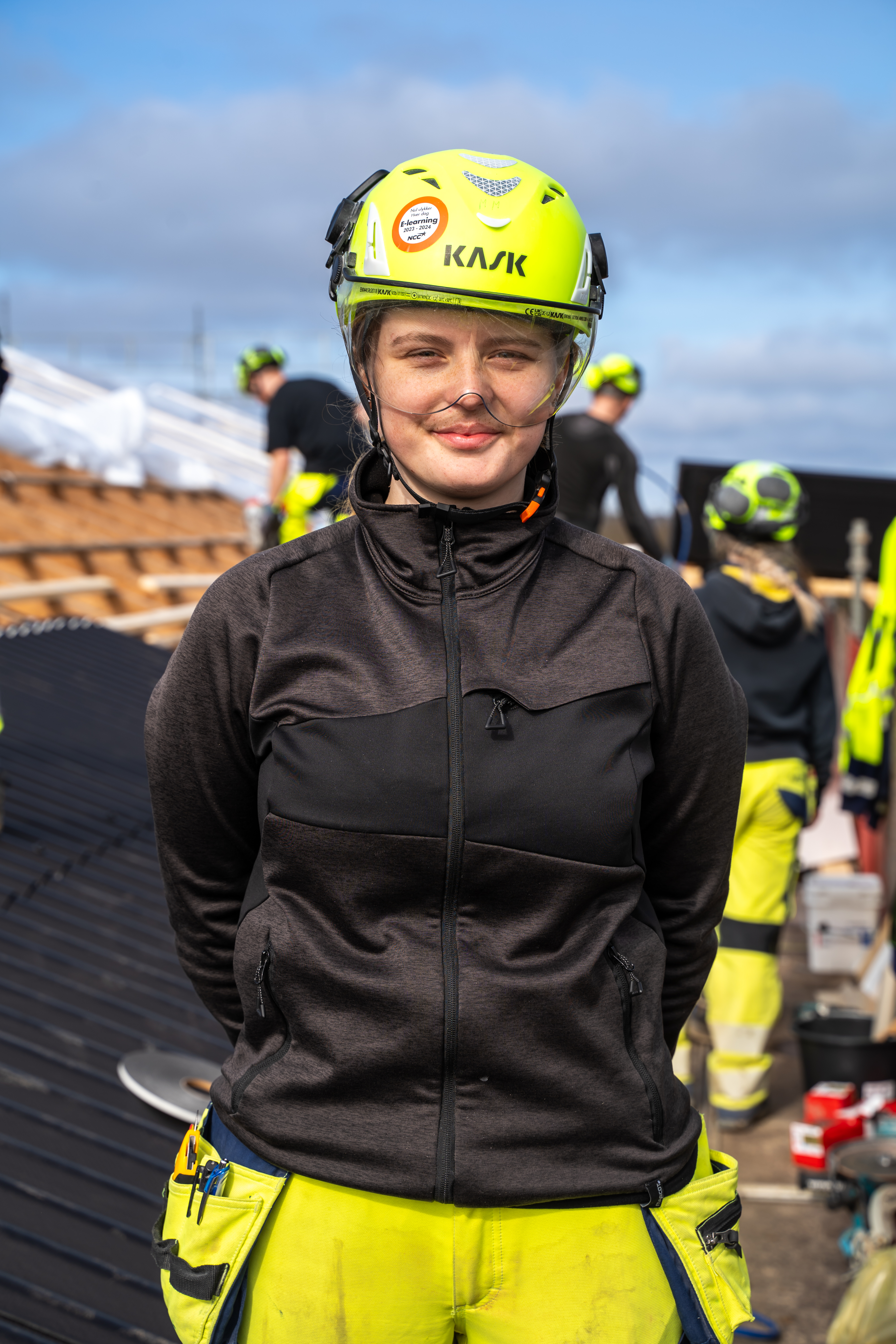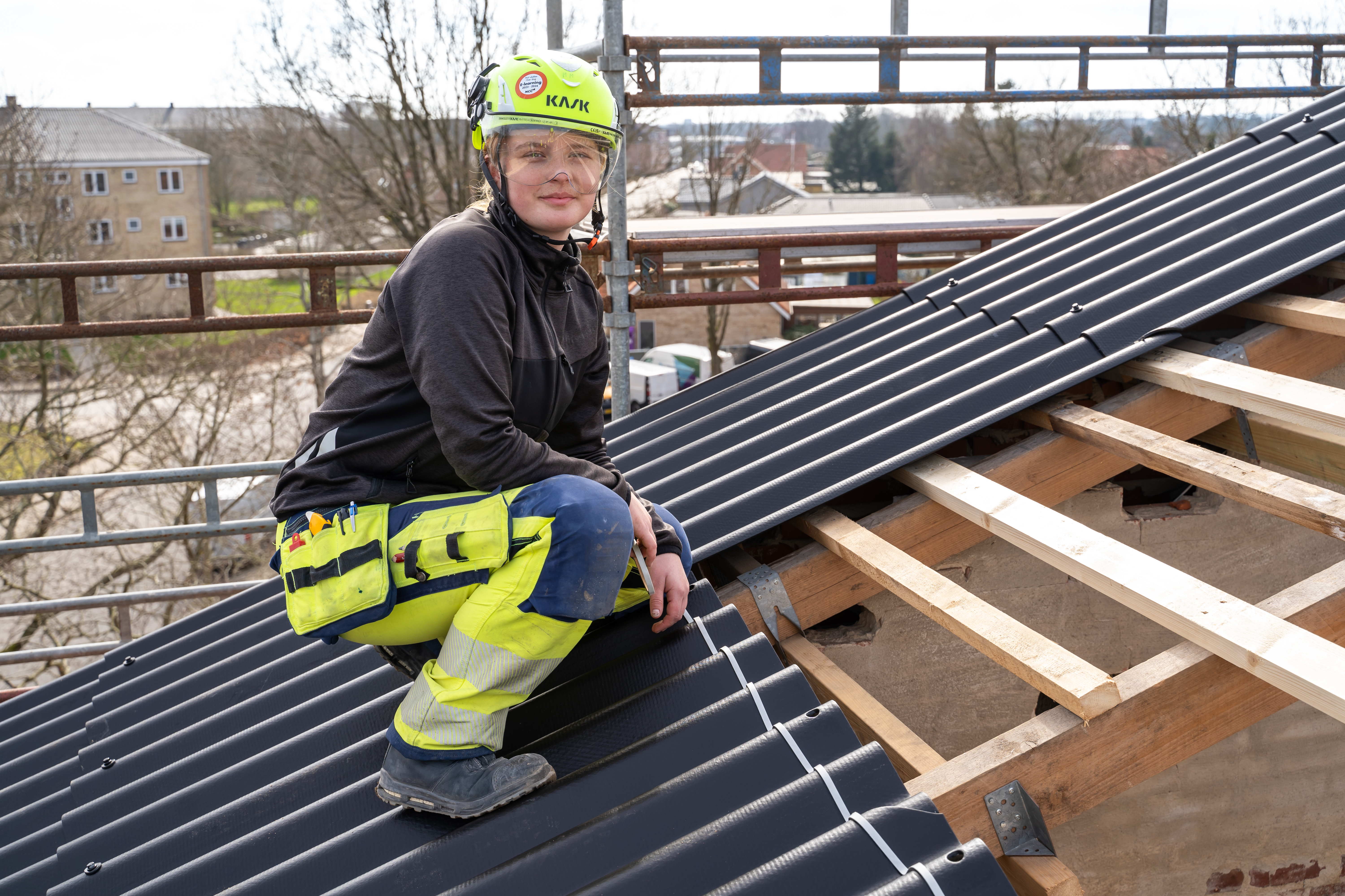 Hun har sikkerhedsgrejet sko, hjelm og briller på og er klar til at lægge nyt tag på boligblokken.